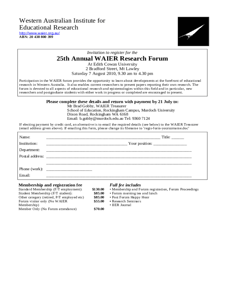 The Western Australian Institute for is a writable document that has to be completed and signed for specified needs. Next, it is provided to the exact addressee in order to provide certain information of certain kinds. The completion and signing is possible manually in hard copy or with a trusted application e. g. PDFfiller. Such applications help to complete any PDF or Word file online. It also lets you customize its appearance depending on your needs and put legit digital signature. Upon finishing, the user sends the Western Australian Institute for to the respective recipient or several recipients by mail and also fax. PDFfiller is known for a feature and options that make your Word form printable. It provides a variety of options when printing out. No matter, how you'll distribute a form after filling it out - physically or electronically - it will always look well-designed and clear. To not to create a new file from scratch every time, turn the original file as a template. Later, you will have a customizable sample.