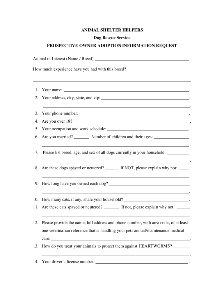 ANIMAL SHELTER HELPERS Dog Rescue Service PROSPECTIVE OWNER ADOPTION INFORMATION REQUEST Animal of Interest (Name / Breed) How much experience have you had with this breed? 1. Your name:. 2. Your