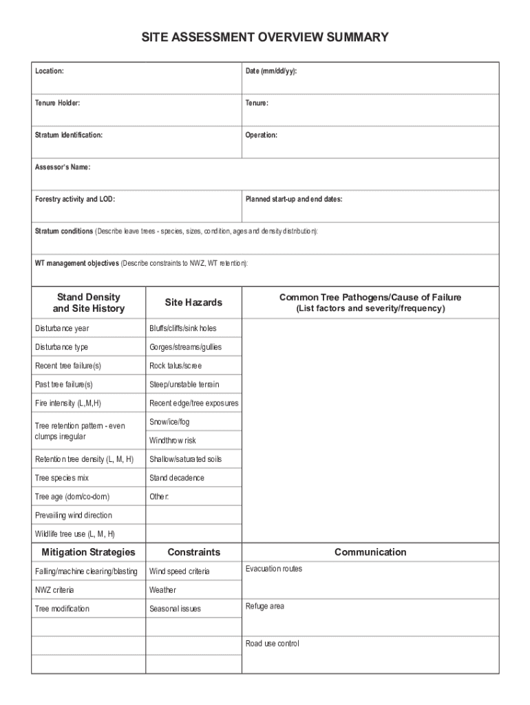 Site Assessment Overview Summary Location:Date (mm/dd/by):Tenure Holder:Tenure:Stratum Identification:Operation:Assessors Name:Forestry activity and LOD:Planned startup and end dates:Stratum conditions
