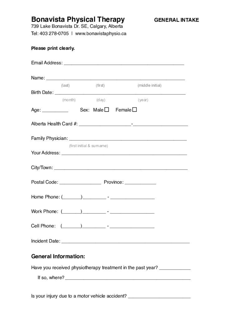 Buenavista Physical TherapyGENERAL INTAKE739 Lake Buenavista Dr. SE, Calgary, Alberta Tel: 403 2780705 www.bonavistaphysio.ca Please print clearly. ! Email Address: Name: (last)(first)(middle initial)Birth