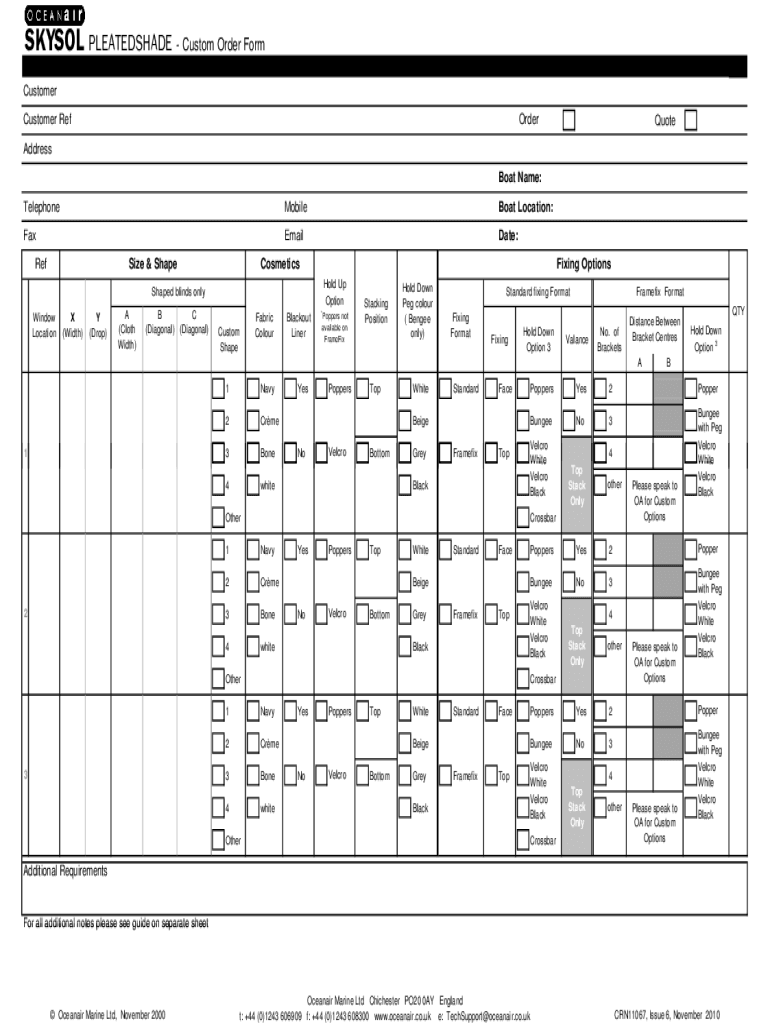 SYSOP PLEATEDSHADE Custom Order Form Customer RefOrderQuoteAddress Boat Name: TelephoneMobileBoat Location:FaxEmailDate:Resize & ShapeCosmeticsFixing Options Hold Up OptionShaped blinds only Window