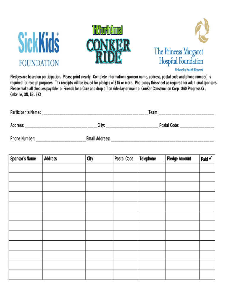 Pledges are based on participation. Please print clearly. Complete information (sponsor name, address, postal code and phone number) is required for receipt purposes. Tax receipts will be issued for