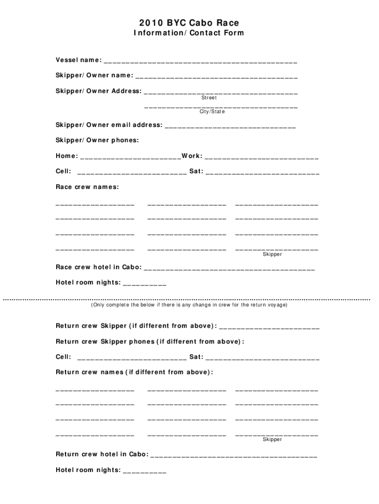 2010 BYC Cab Race Information/Contact Form Vessel name: Skipper/Owner name: Skipper/Owner Address: Street City/State Skipper/Owner email address: Skipper/Owner phones: Home: Work: Cell: Sat: Race