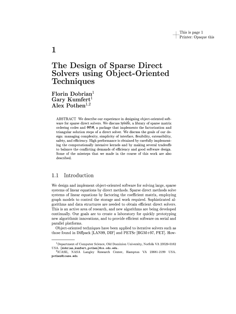 This is page 1 Printer: Opaque this 1 The Design of Sparse Direct Solvers using Object-Oriented Techniques Florin Dobrian11 Gary Number Alex Pothen1 2 ABSTRACT We describe our experience in designing