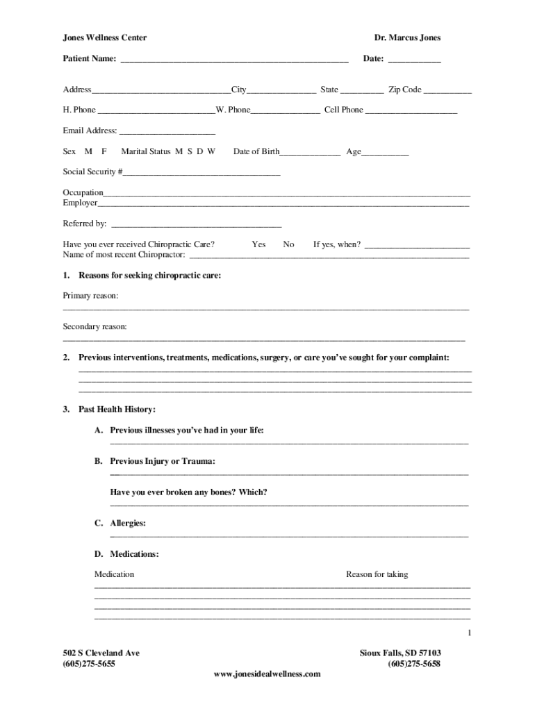 Jones Wellness Center Dr. Marcus JonesPatient Name: Date: Address City State Zip Code H. Phone W. Phone Cell Phone Email Address: Seem Marital Status M S DW Date of Birth Age Social Security # Occupation
