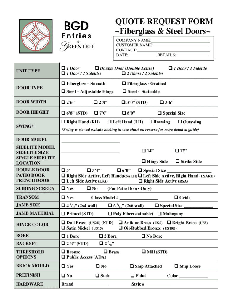 QUOTE REQUEST FORM Fiberglass & Steel Doors COMPANY NAME: CUSTOMER NAME: CONTACT: DATE:UNIT TYPERETAIL $: 1 Door Double Door (Double Active) 1 Door / 2 Sidelines 2 Doors / 2 Sidelines Fiberglass Smooth
