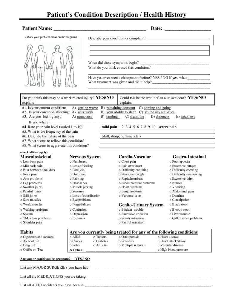 Patients Condition Description / Health History Patient Name: Date: (Mark your problem areas on the diagram)Describe your condition or complaint: When did these symptoms begin? What do you think caused