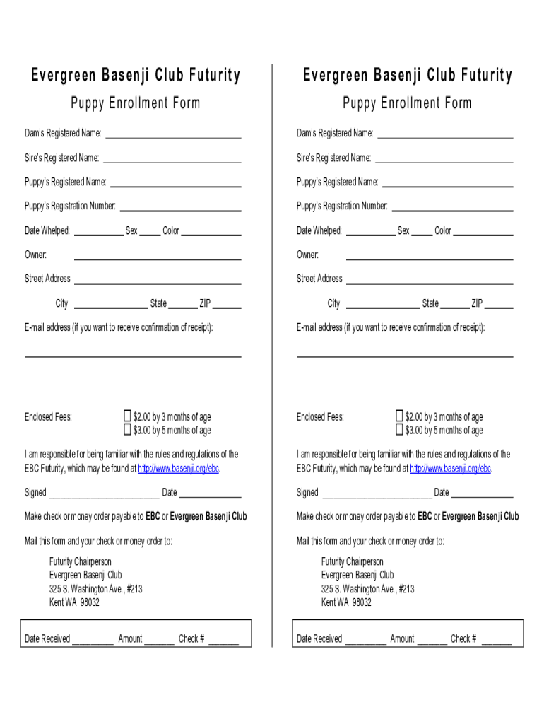 Evergreen Benji Club Futurity Evergreen Benji Club Futurity Puppy Enrollment FormPuppy Enrollment Formats Registered Name:Dams Registered Name:Sires Registered Name:Sires Registered Name:Puppies Registered