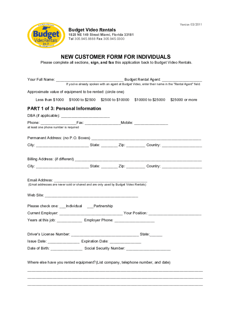Version 03/2011Budget Video Rentals 1825 NE 149 Street Miami, Florida 33181 Tel 305.945.8888 Fax 305.945.0300NEW CUSTOMER FORM FOR INDIVIDUALS Please complete all sections, sign, and fax this application