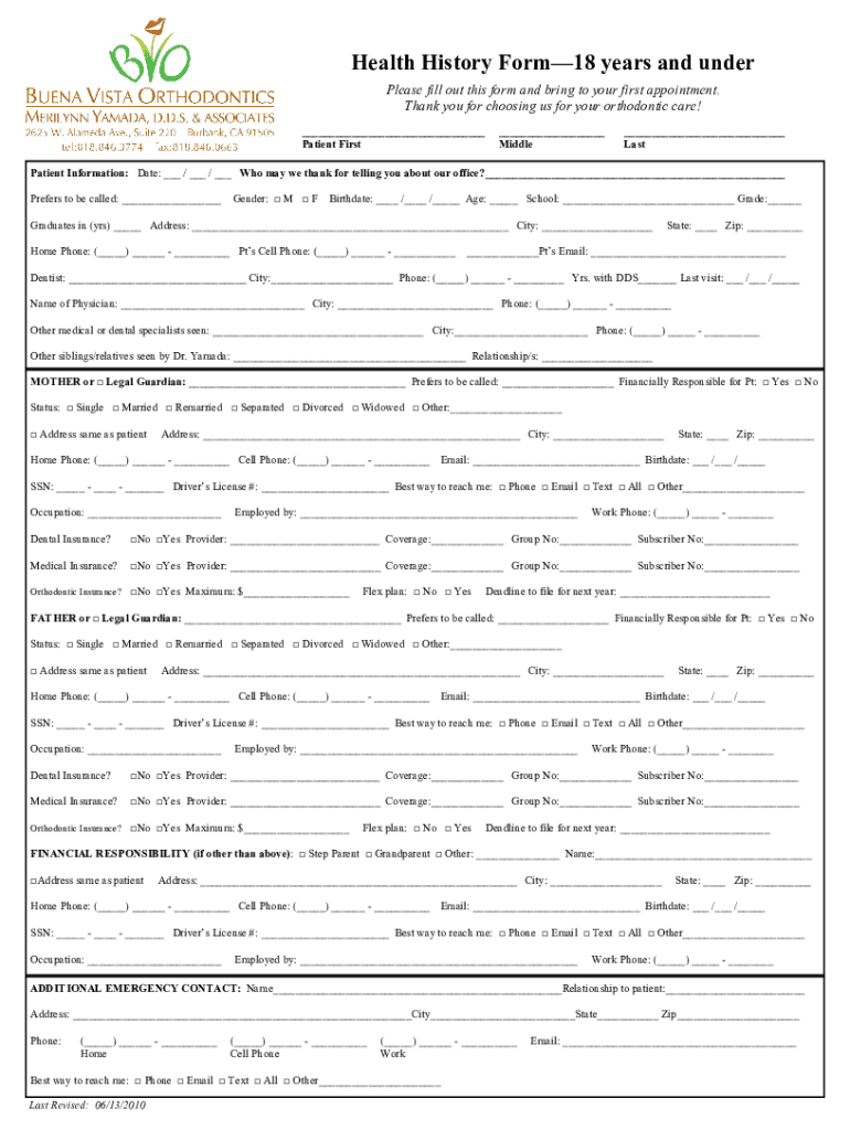 Health History Form18 years and under Please fill out this form and bring to your first appointment. Thank you for choosing us for your orthodontic care! Patient First Middle Outpatient Information: