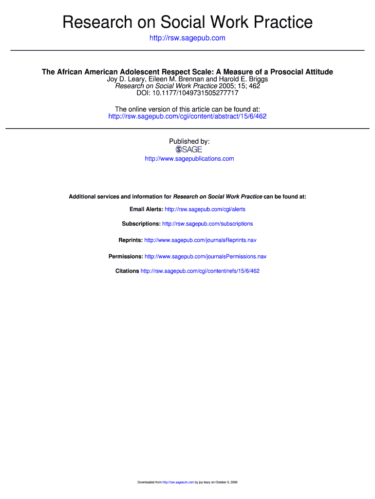 Research on Social Work Practice http://rsw.sagepub.com The African American Adolescent Respect Scale: A Measure of a Prosocial Attitude Joy D. Leary, Eileen M. Brennan and Harold E. Briggs Research