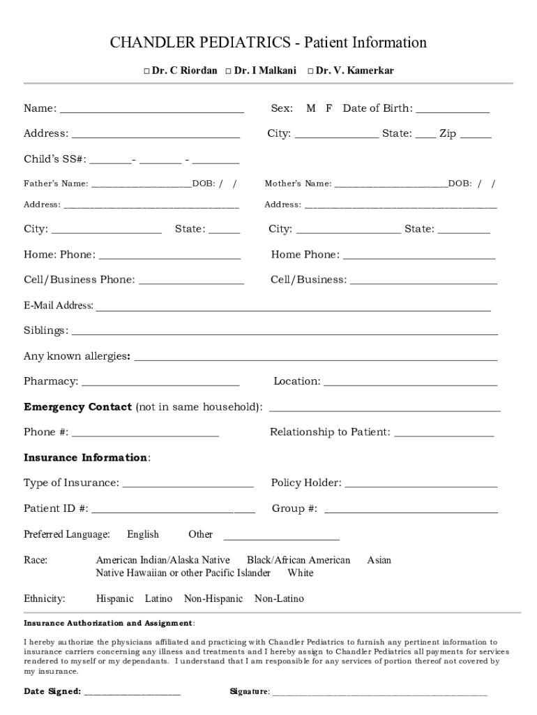 CHANDLER PEDIATRICS Patient Information Dr. C Riordan Dr. I Balkan Dr. V. Camera Name: Sex:Address: M F Date of Birth: City: State: Zip Child's SS#: Fathers Name: DOB: / /Mothers Name: DOB: / /Address: