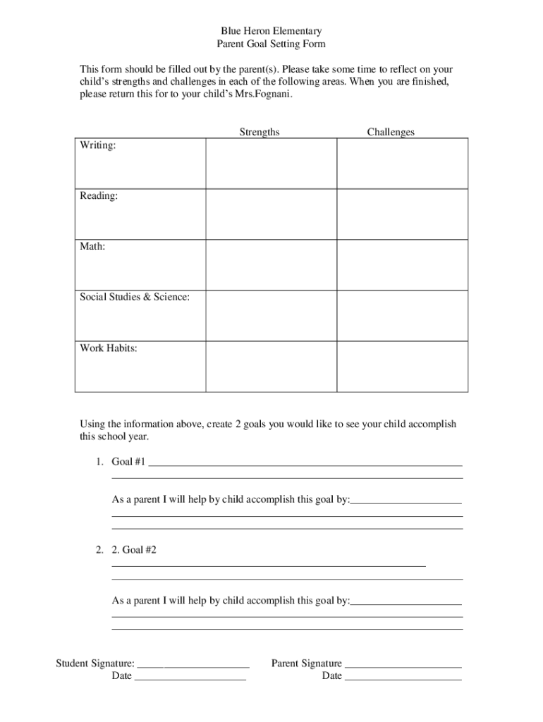 Blue Heron Elementary Parent Goal Setting Form This form should be filled out by the parent(s). Please take some time to reflect on your children strengths and challenges in each of the following