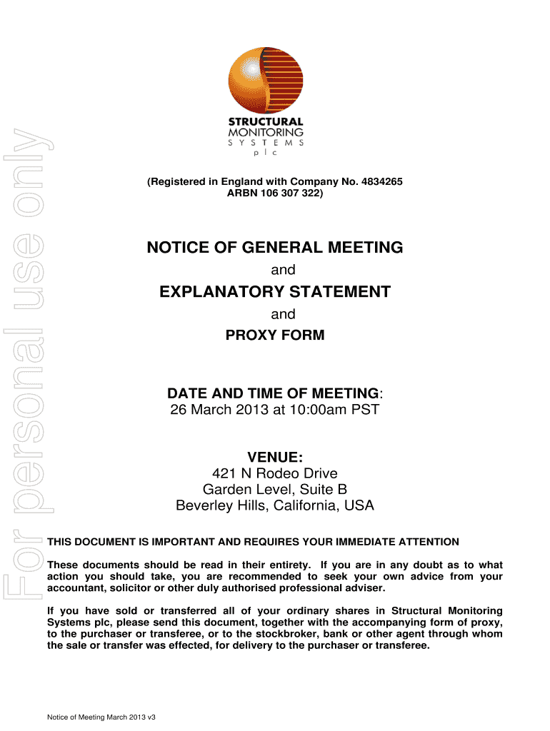 For personal use only (Registered in England with Company No. 4834265 ARON 106 307 322) NOTICE OF GENERAL MEETING and EXPLANATORY STATEMENT and PROXY FORM DATE AND TIME OF MEETING: 26 March 2013 at