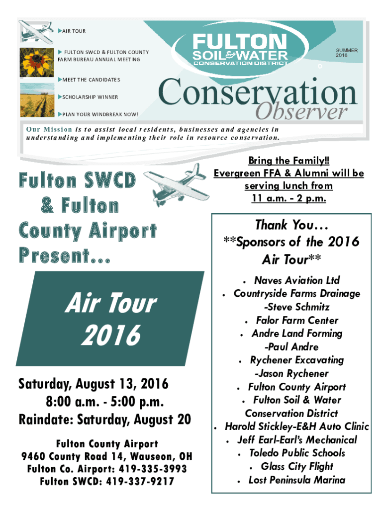 AIR TOUR SUMMER 2016 FULTON SACD & FULTON COUNTY FARM BUREAU ANNUAL MEETING MEET THE CANDIDATES SCHOLARSHIP WINNER PLAN YOUR WINDBREAK NOW! Conservation Observer Mission is t o assist local r ESD
