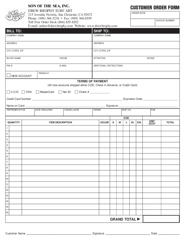 SON OF THE SEA, INC. DREW TROPHY SURF CUSTOMER ORDER FORM ORDER DATE215 Agenda Victoria, San Clemente, CA 92672 Phone: (949) 3665236 Fax: (949) 3666595 Toll Free Order Desk (866) 8298202 Email: orders