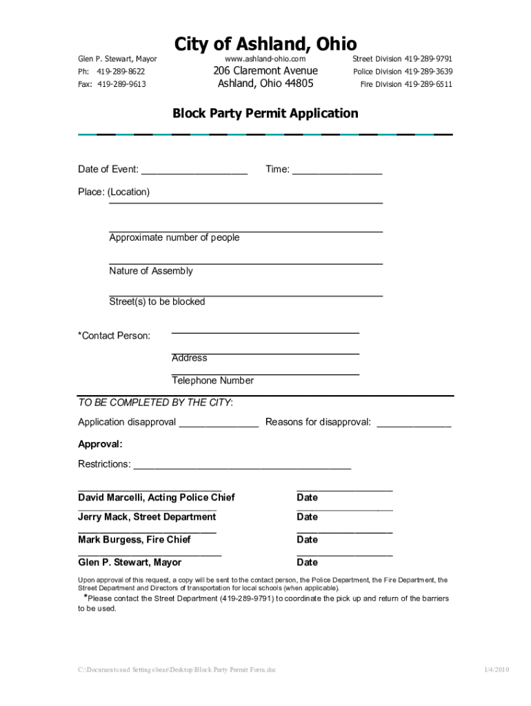 The block party permit form is a document that residents must fill out to request permission from local authorities to hold a block party, which typically involves the closure of a street for a social gathering.