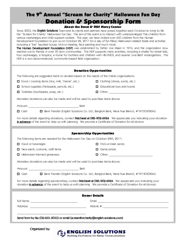 The 9th Annual Scream for Charity Halloween Fun Donation & Sponsorship Form About the Event & HDF Mercy Centerpiece 2003, the English Solutions Team and its clients and partners have joined together