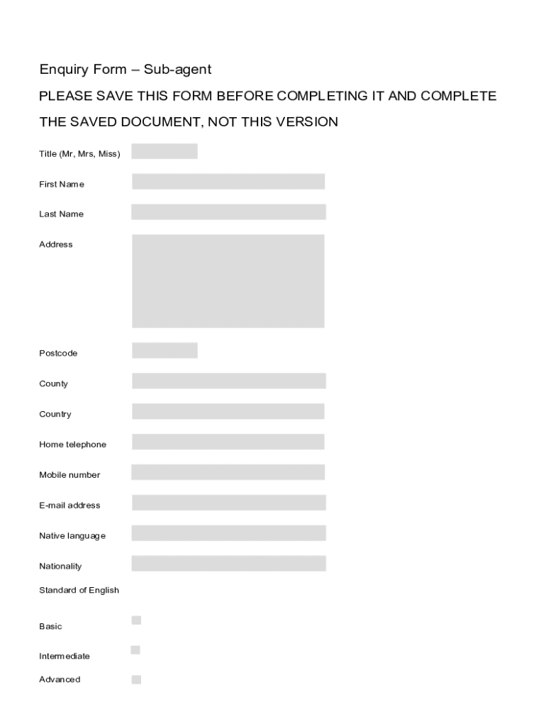 Inquiry Form Subagent PLEASE SAVE THIS FORM BEFORE COMPLETING IT AND COMPLETE THE SAVED DOCUMENT, NOT THIS VERSION Title (Mr, Mrs, Miss) First Name Last Name AddressPostcode County Country Home telephone