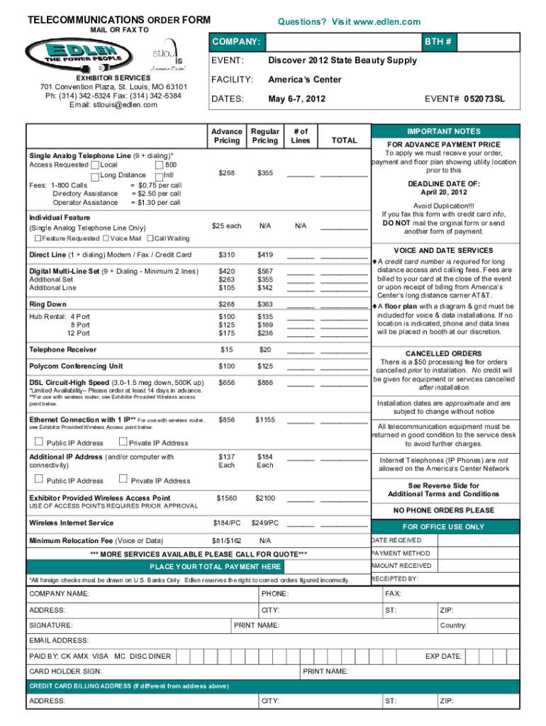 TELECOMMUNICATIONS ORDER Formulations? Visit www.edlen.comMAIL OR FAX COMPANY:EXHIBITOR SERVICES701 Convention Plaza, St. Louis, MO 63101 pH: (314) 3425324 Fax: (314) 3425384 Email: Louis Ellen. Commingle