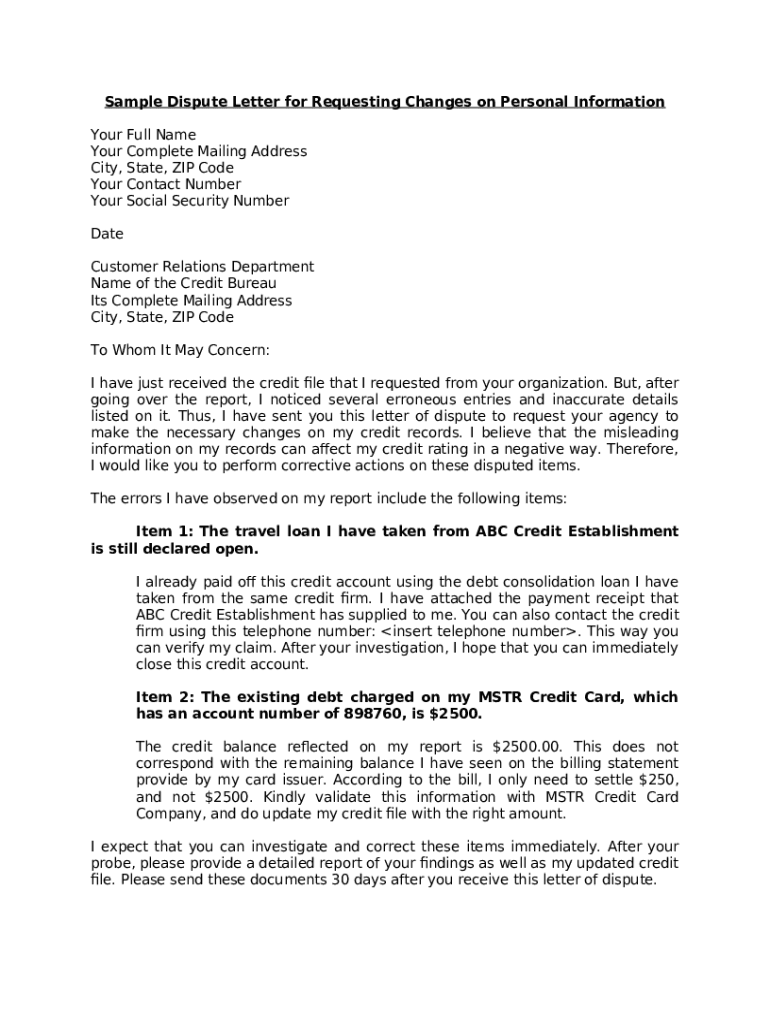 What is Sample Dispute Letter for Requesting Changes on Personal Ination Form?