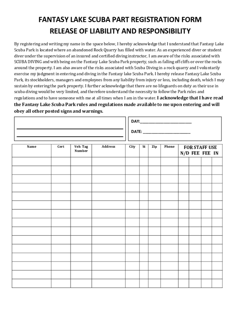FANTASY LAKE SCUBA PART REGISTRATION FORM
