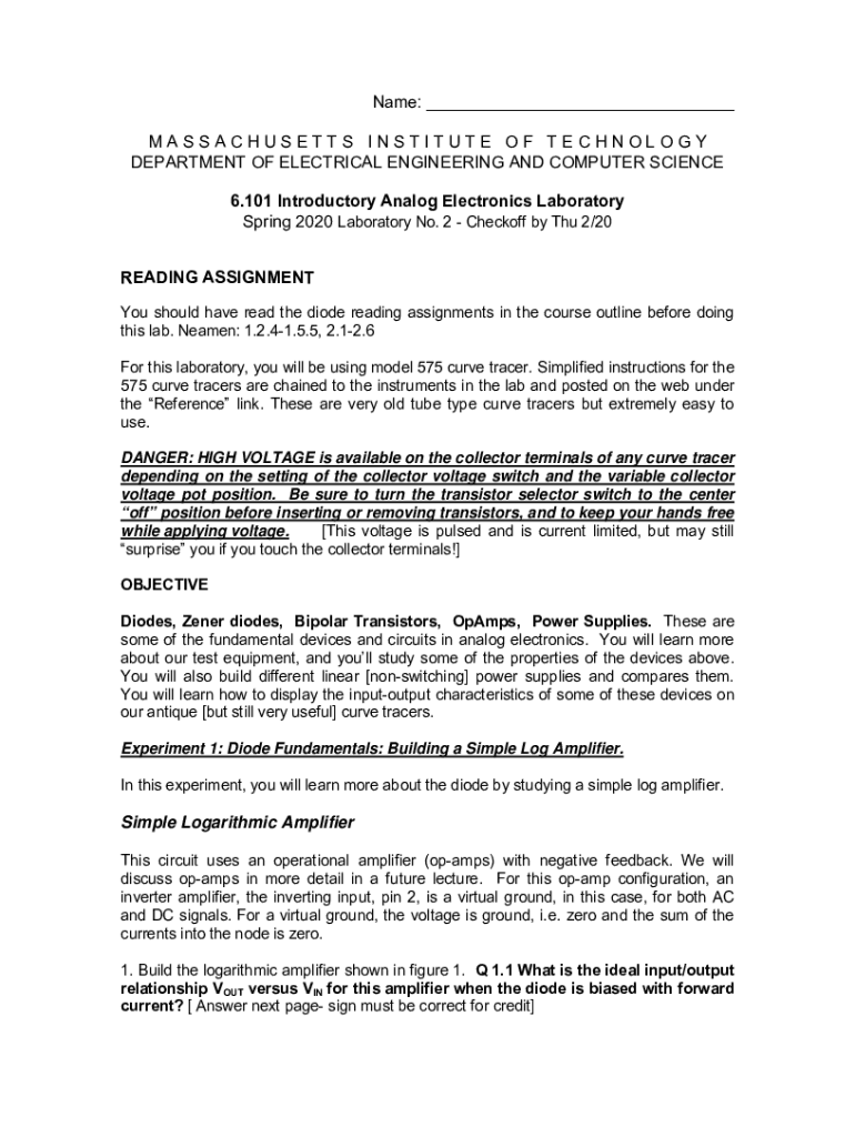 Name: MASSACHUSETTS INSTITUTE OF TECHNOLOGY DEPARTMENT OF ELECTRICAL ENGINEERING AND COMPUTER SCIENCE 6.101 Introductory Analog Electronics Laboratory Spring 2020 Laboratory No. 2 Checkoff by Thu