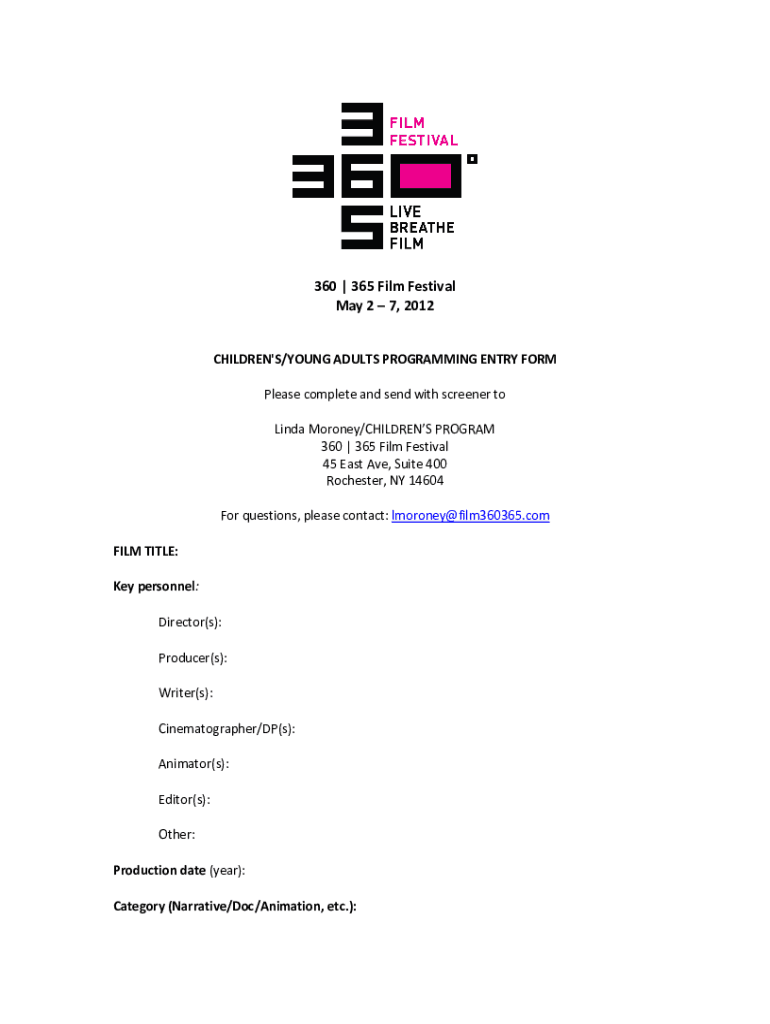 360 365 Film Festival May 2 7, 2012CHILDREN IS/YOUNG ADULTS PROGRAMMING ENTRY FORM Please complete and send with screener to Linda Mooney/CHILDREN PROGRAM 360 365 Film Festival 45 East Ave, Suite