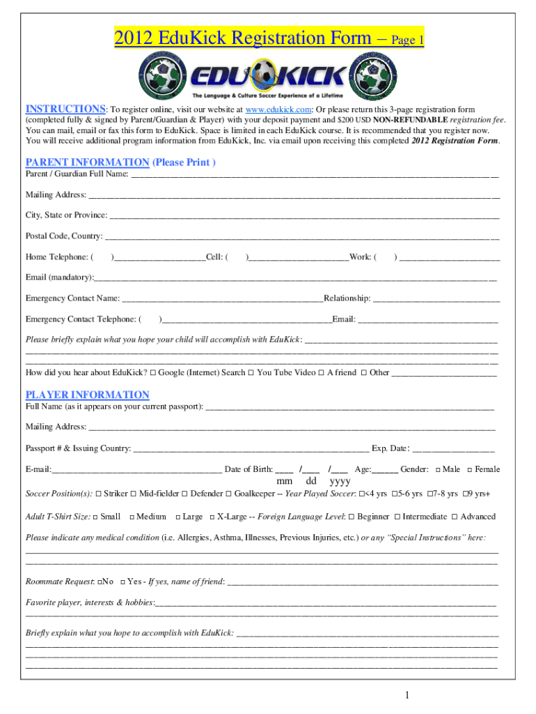 Get the free 2012 EduKick Registration Form Page 1
