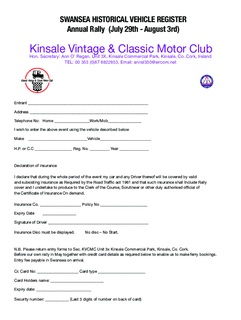 SWANSEA HISTORICAL VEHICLE REGISTER Annual Rally (July 29th August 3rd)Kin sale Vintage & Classic Motor Club Hon. Secretary: Ann O Regan, Unit 3X, Kin sale Commercial Park, Kin sale, Co. Cork, Ireland