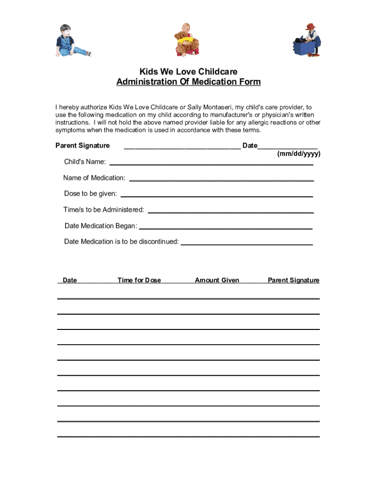 Kids We Love Childcare Administration Of Medication Form I hereby authorize Kids We Love Childcare or Sally Monastery, my child's care provider, to use the following medication on my child according