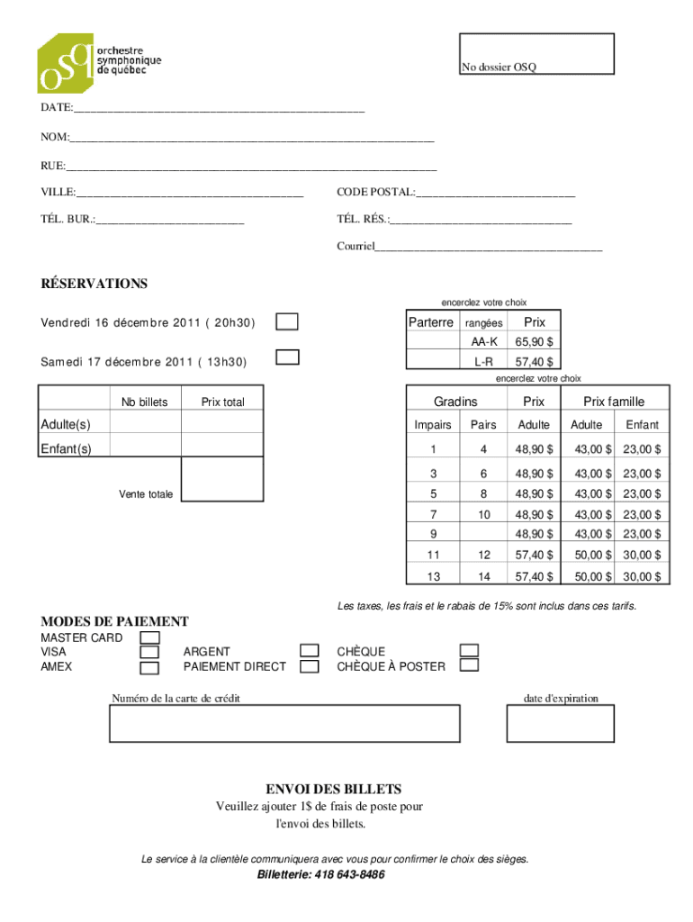 No dossier SEDATE: NOT: RUE: VILLA: CODE POSTAL: TL. BUR.: TL. RS.: Courier RESERVATIONS encircled vote choixVendredi 16 December 2011 (20h30)Parterre rangesSamedi 17 December 2011 (13h30)PrixAAK$65,90LR$57,40