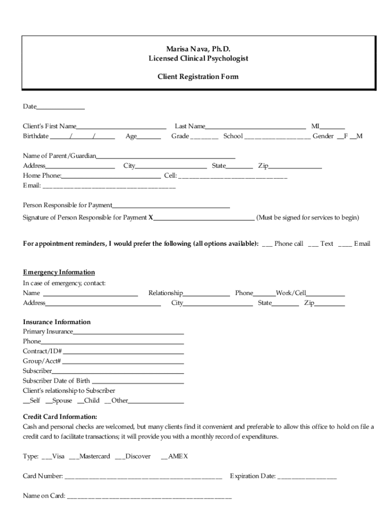 Marisa Navy, Ph.D. Licensed Clinical Psychologist Client Registration Format Clients First Name Birthdate //Last Name MI Grade School GenderAgeFMName of Parent/Guardian Address City State Zip Home