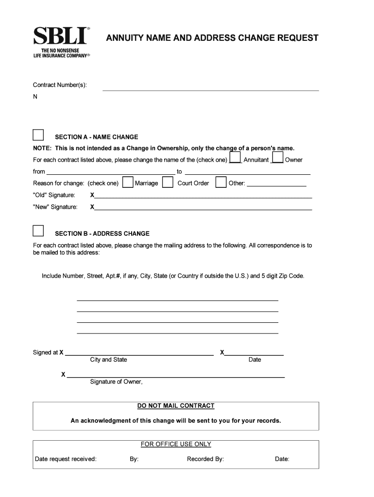 The form can be filled out by annuitants and contract owners who need to update their name or address related to an annuity contract.