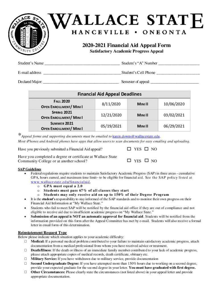 20202021 Financial Aid Appeal Form Satisfactory Academic Progress Appeal Students Name Students A Number Email address Students Cell Phone Declared Major: Semester of appeal: Financial Aid Appeal