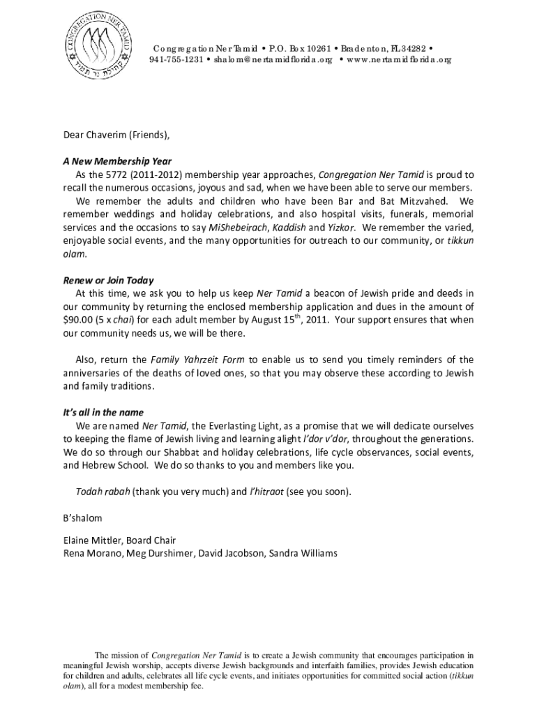 Congregation NER Tamil P.O. Box 10261 Bradenton, FL 34282 9417551231 shalom nertamidflorida.org www.nertamidflorida.orgDear Charm (Friends), A New Membership Year As the 5772 (20112012) membership