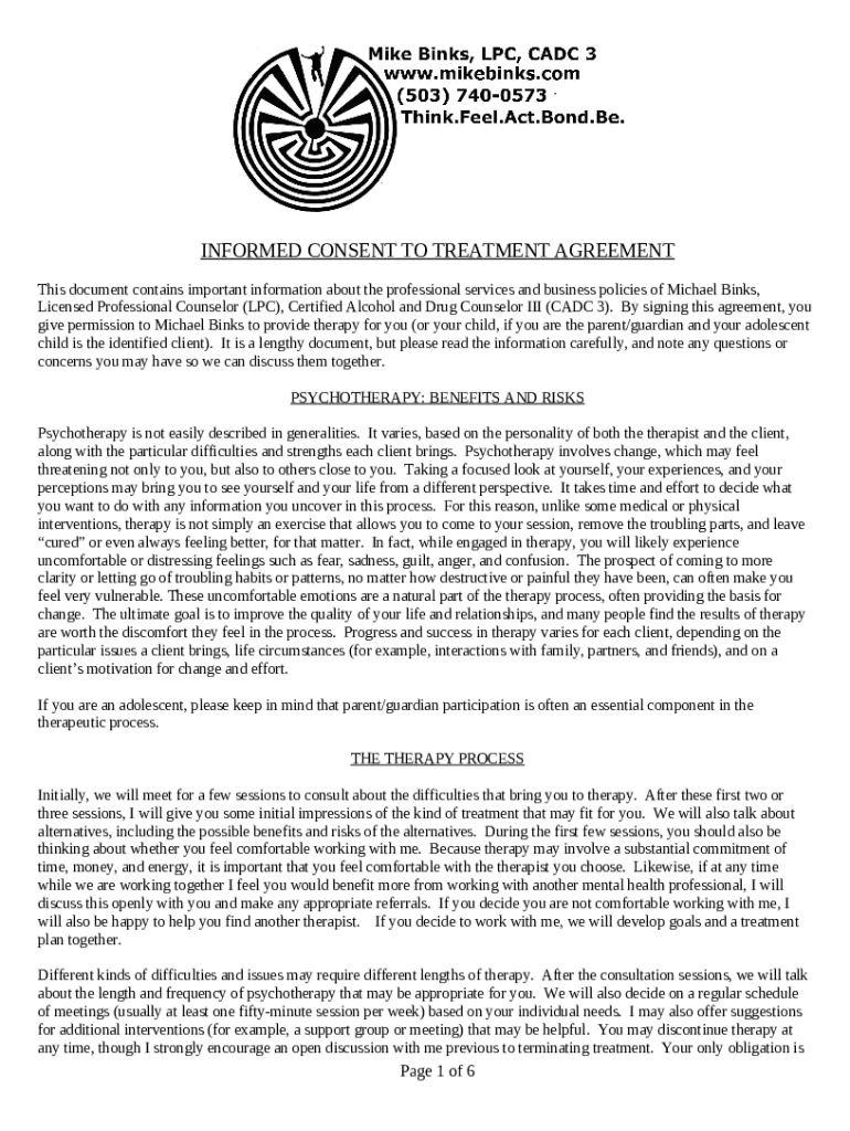 Instructions for the form By signing this agreement, you give permission to Michael Binks to provide therapy for you (or your child, if you are the parent/guardian and your adolescent child is the identified client)