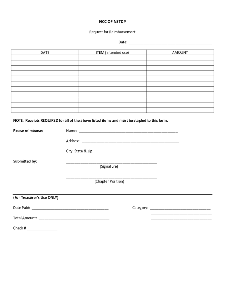 NCC OF NS TDP Request for Reimbursement Date: DETECTED (intended use)AMOUNTNOTE: Receipts REQUIRED for all the above listed items and must be stapled to this form. Please reimburse:Name: Address:
