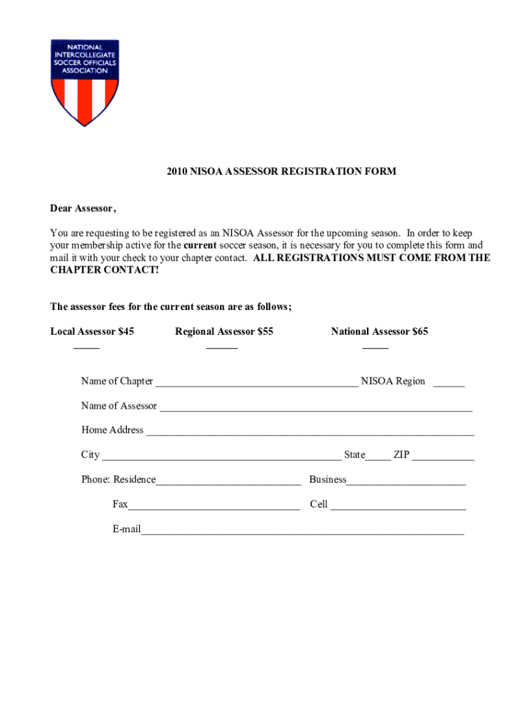 2010 NI SOA ASSESSOR REGISTRATION FORM Dear Assessor, You are requesting to be registered as an NI SOA Assessor for the upcoming season. In order to keep your membership active for the current soccer
