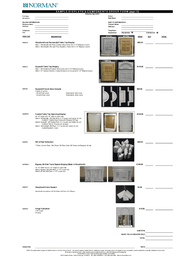 S A M P L E D I S P L A Y S & C O M P O N E N T S O R D E R F O R M (page 1/3) Effective April 2010 P.O. Date: Account #:P.O.#: Side Mark:BILLING INFORMATION Business Name: Address:SHIP TO INFORMATION