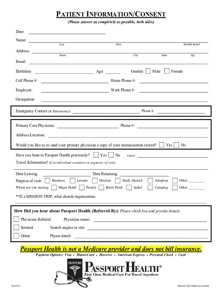 Ensure to include a section for the patient to sign a consent form, granting permission for medical treatment and the release of medical records, if required.