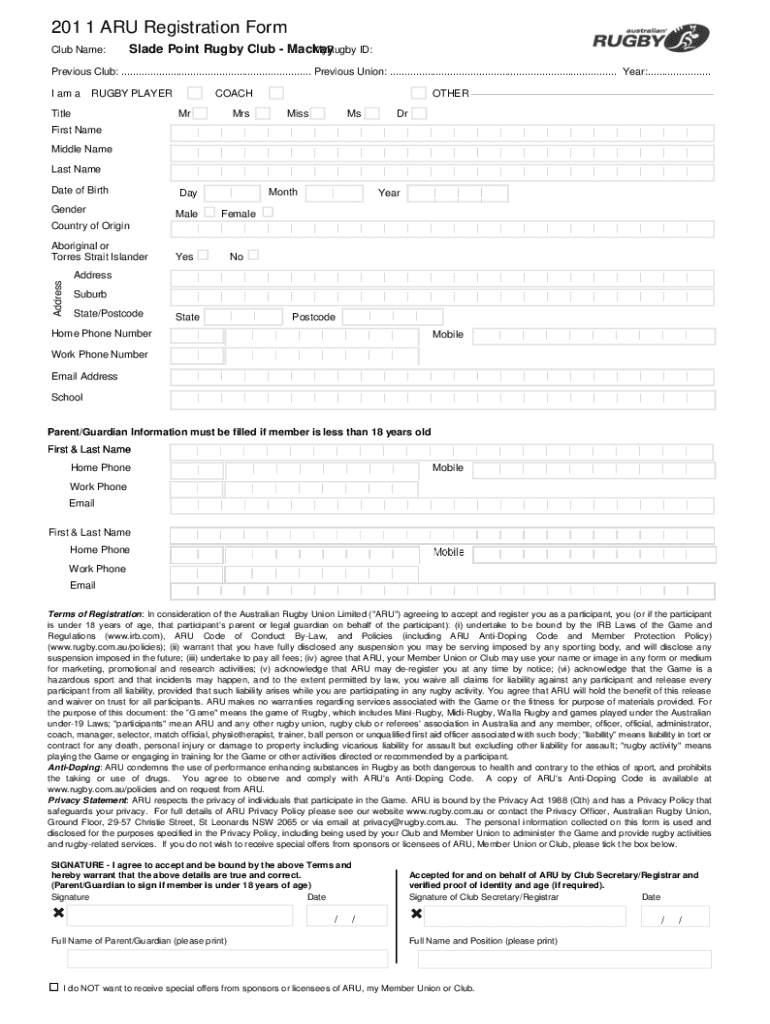 201 1 ARU Registration Form Club Name:Rugby ID: Slave Point Rugby Club MackayPrevious Club: .................................................................. Previous Union: ...............................................................................