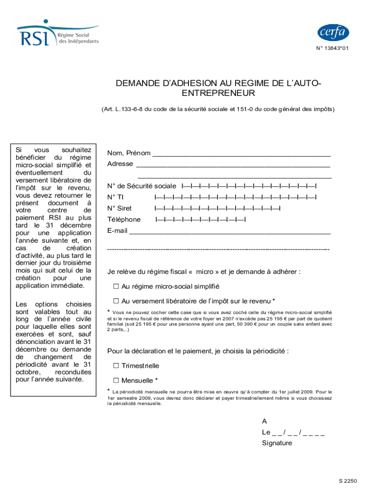 N 13843×01DEMANDE ADHESION AU REGIME DE LAUTOENTREPRENEUR (Art. L.13368 Du code DE la security social ET 1510 Du code gnarl DES imps)Si vows souhaitez officer Du regime microsocial simplify et ventuellement