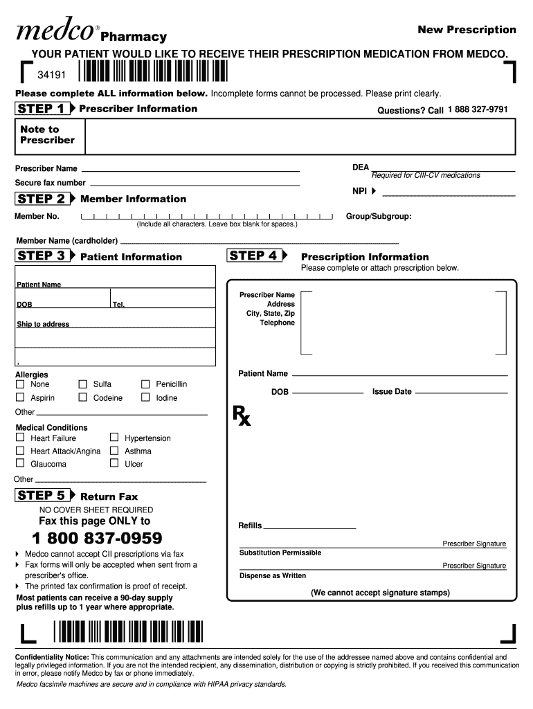 This form is used for submitting a new prescription for medication, ensuring all required patient and prescriber information is provided clearly for processing.