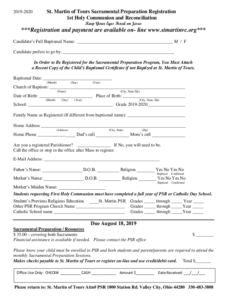 20192020St. Martin of Tours Sacramental Preparation Registration 1st Holy Communion and Reconciliation Keep Your Eyes Fixed on Jesus***Registration and payment are available online www.stmartinvc.org***