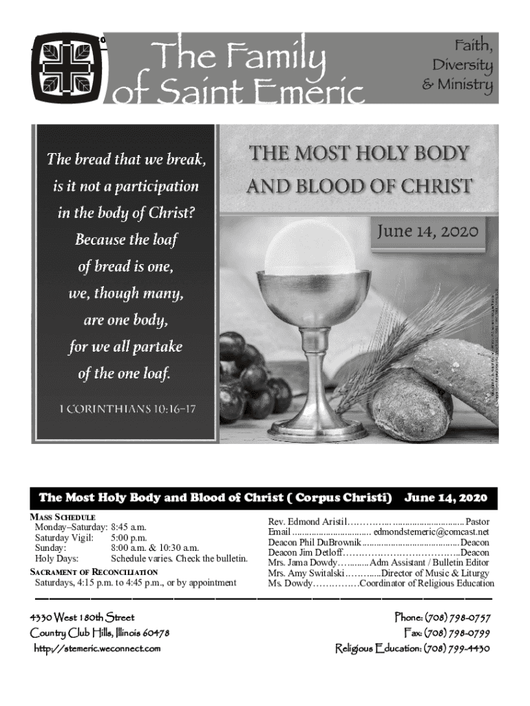 June 14, 2020Most Holy Body and Blood of Christ Page 1The Most Holy Body and Blood of Christ June 14, 2020, Thirty first Sunday in Ordinary Time(Corpus Christi) November 4, 2012, M S Monday Saturday: