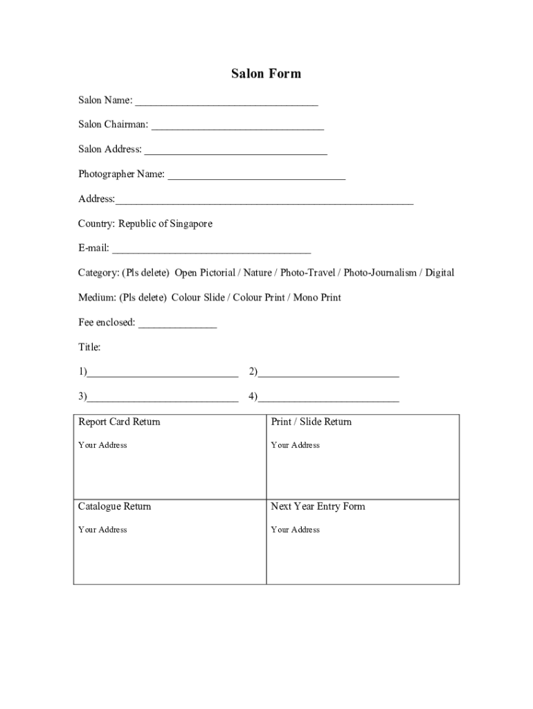 Salon Form Salon Name: Salon Chairman: Salon Address: Photographer Name: Address: Country: Republic of Singapore Email: Category: (Pls delete) Open Pictorial / Nature / PhotoTravel / Photojournalism