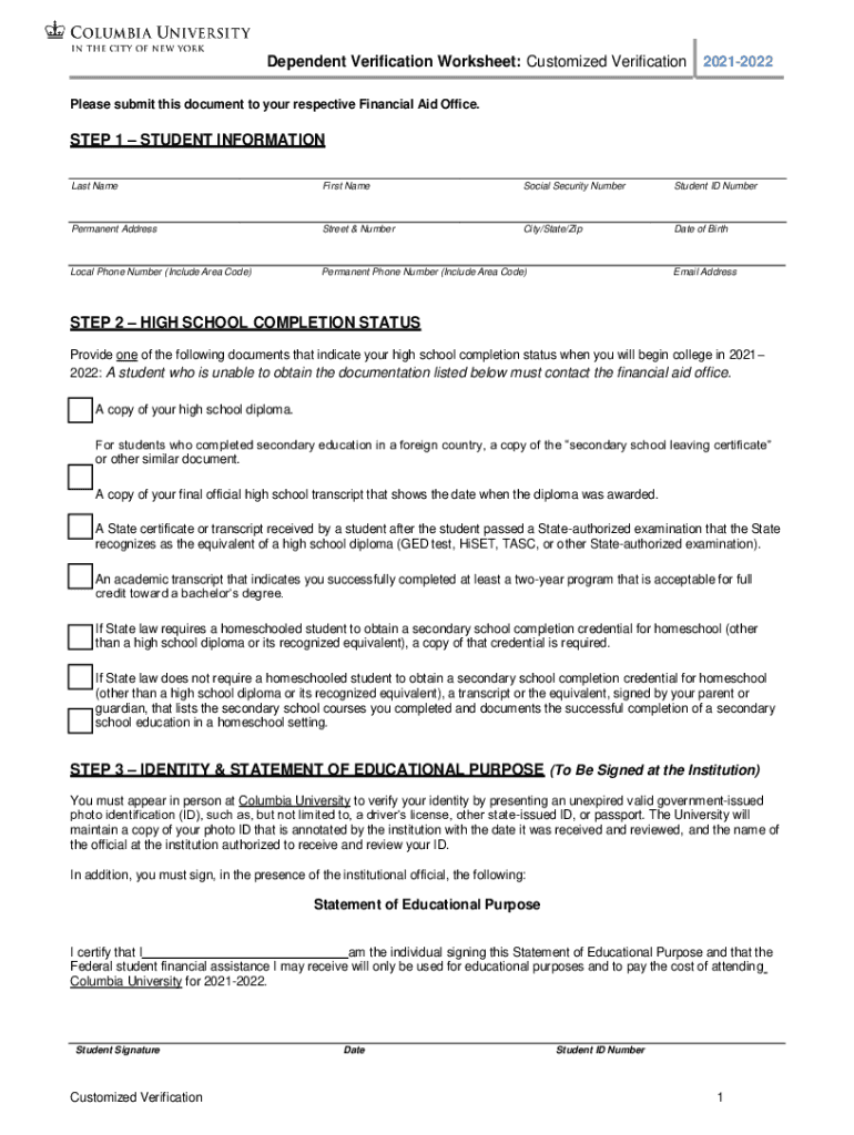 Dependent Verification Worksheet: Customized Verification20212022Please submit this document to your respective Financial Aid Office. STEP 1 STUDENT INFORMATION Last NameFirst Asocial Security NumberStudent