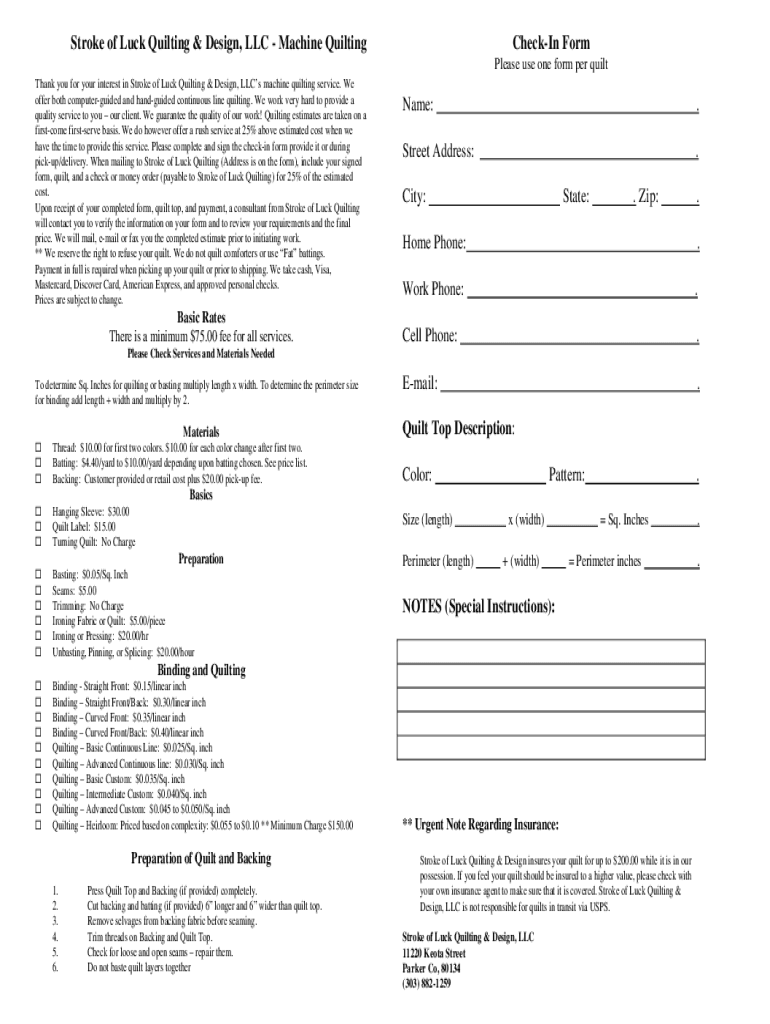 Stroke of Luck Quilting & Design, LLC Machine QuiltingCheckIn Form Please use one form per quiltThank you for your interest in Stroke of Luck Quilting & Design, LCS machine quilting service. We offer