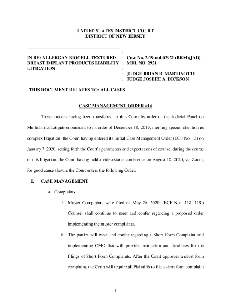 UNITED STATES DISTRICT COURT DISTRICT OF NEW JERSEY : IN RE: ALLERGEN BOWELL TEXTURED : BREAST IMPLANT PRODUCTS LIABILITY : LITIGATION : : :Case No. 2:19md02921 (BRM)(HAD) MDL NO. 2921 JUDGE BRIAN